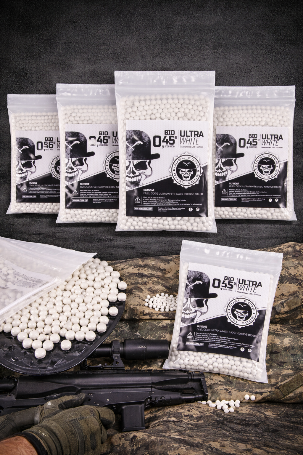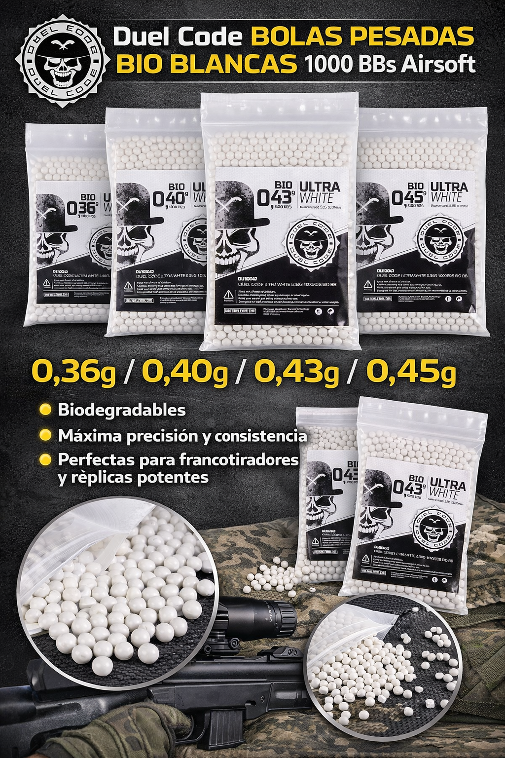 Duel Code Bolas Pesadas Bio Blancas 0,36g 0,40g 0,43g 0,45g – 1000 BBs Airsoft