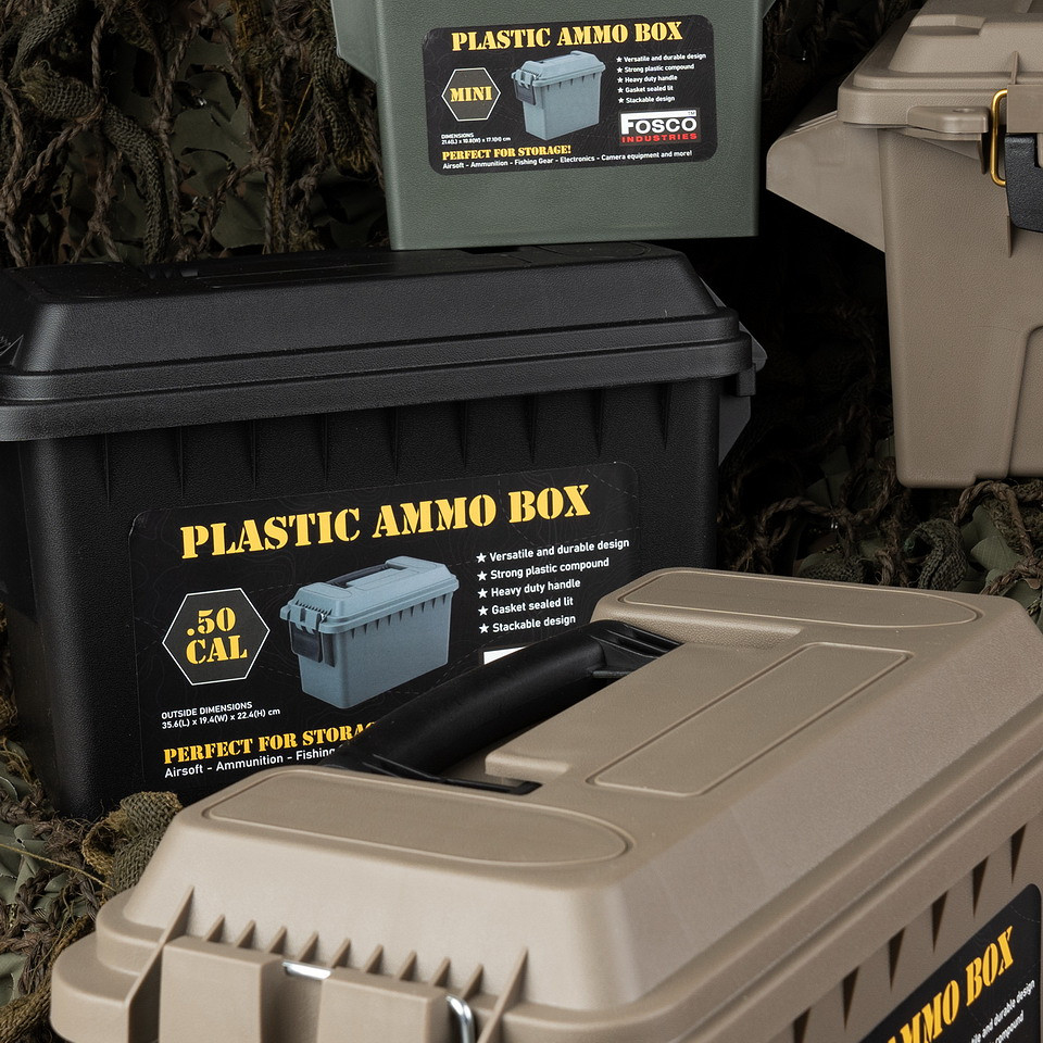 CAJA DE MUNICIÓN EN PLÁSTICO CALIBRE .50, COLOR VERDE.
