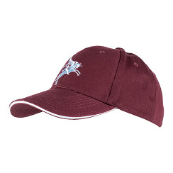 Gorra de algodón grueso en color granate (maroon), el emblema de Pegaso está bordado en un clarísimo celeste, casi blanco.